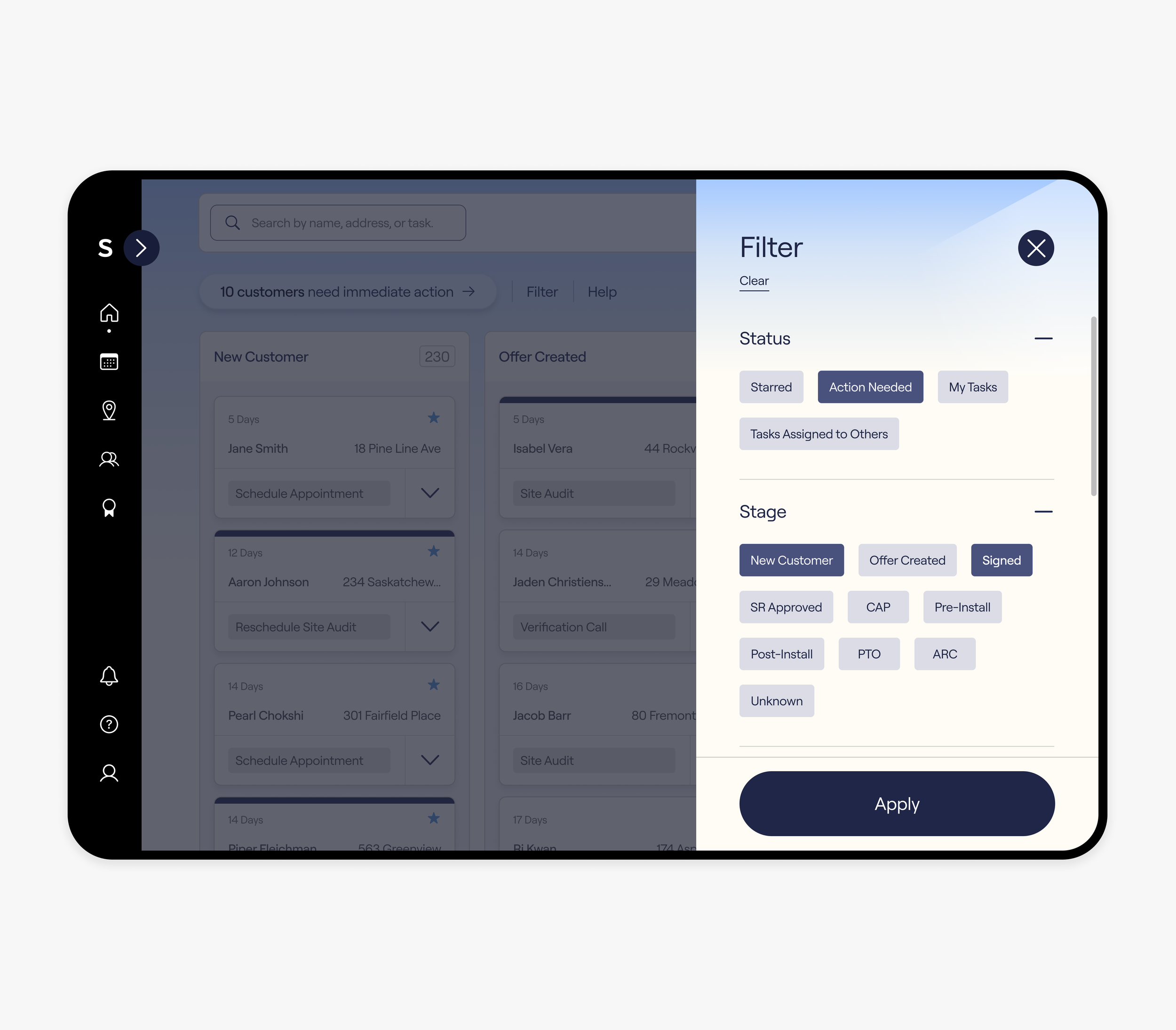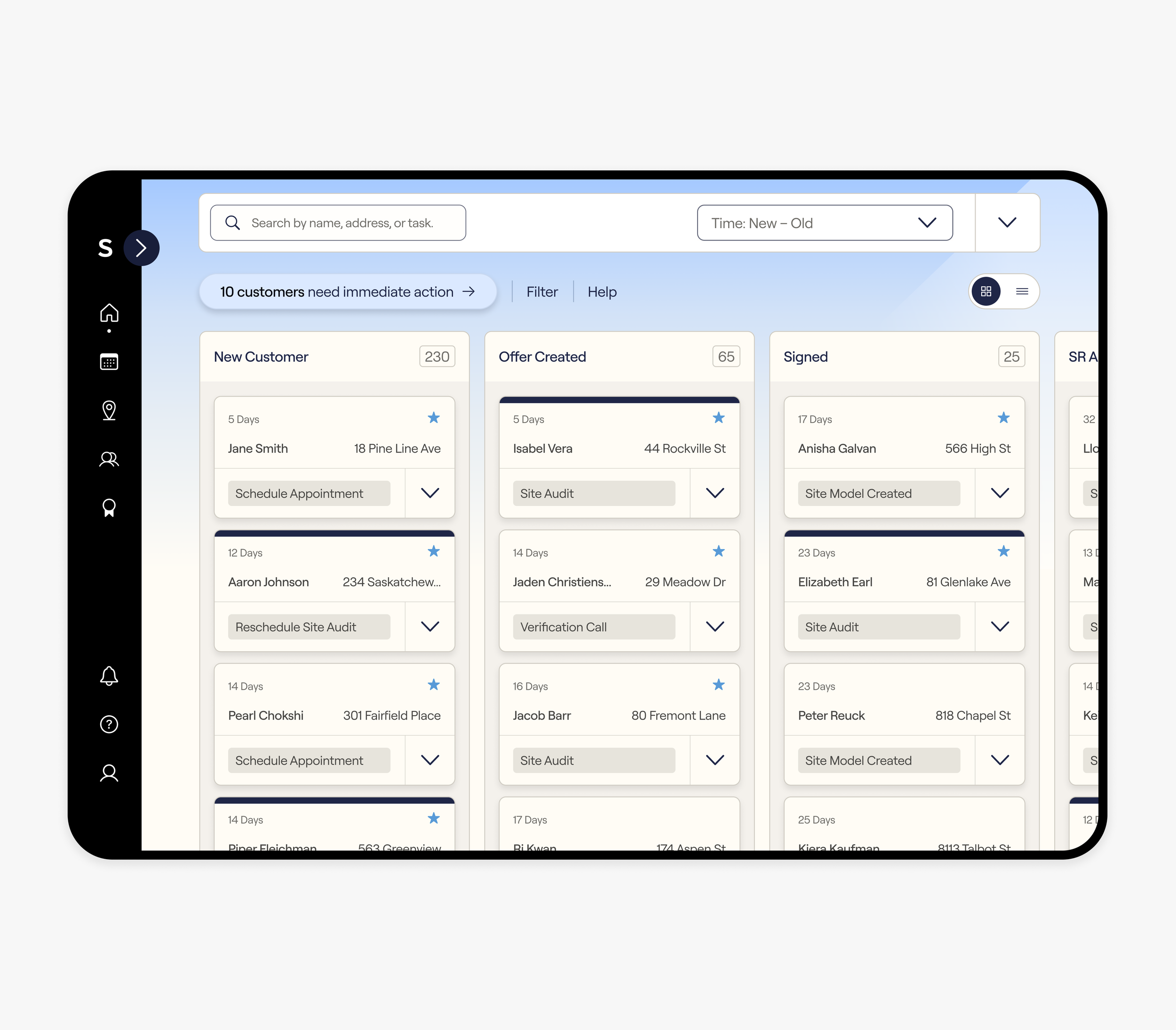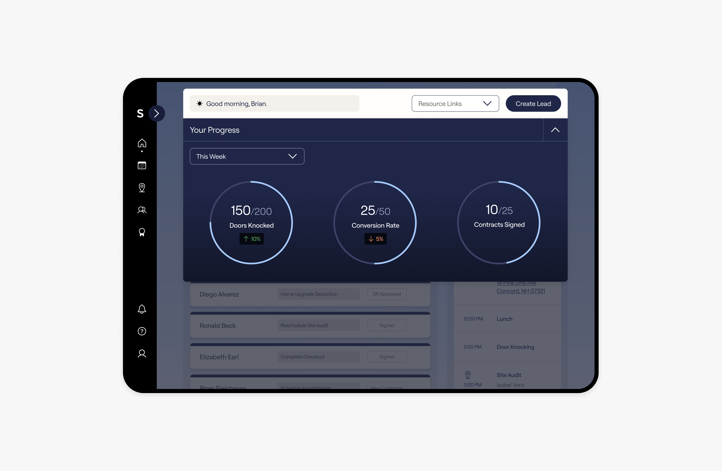 Sunrun sales representatives self-generate sale leads and present in-home to potential customers. The Sales App supports reps by clearly showing their top daily task, making objectives easily actionable, and tracking their progress towards quarterly goals.